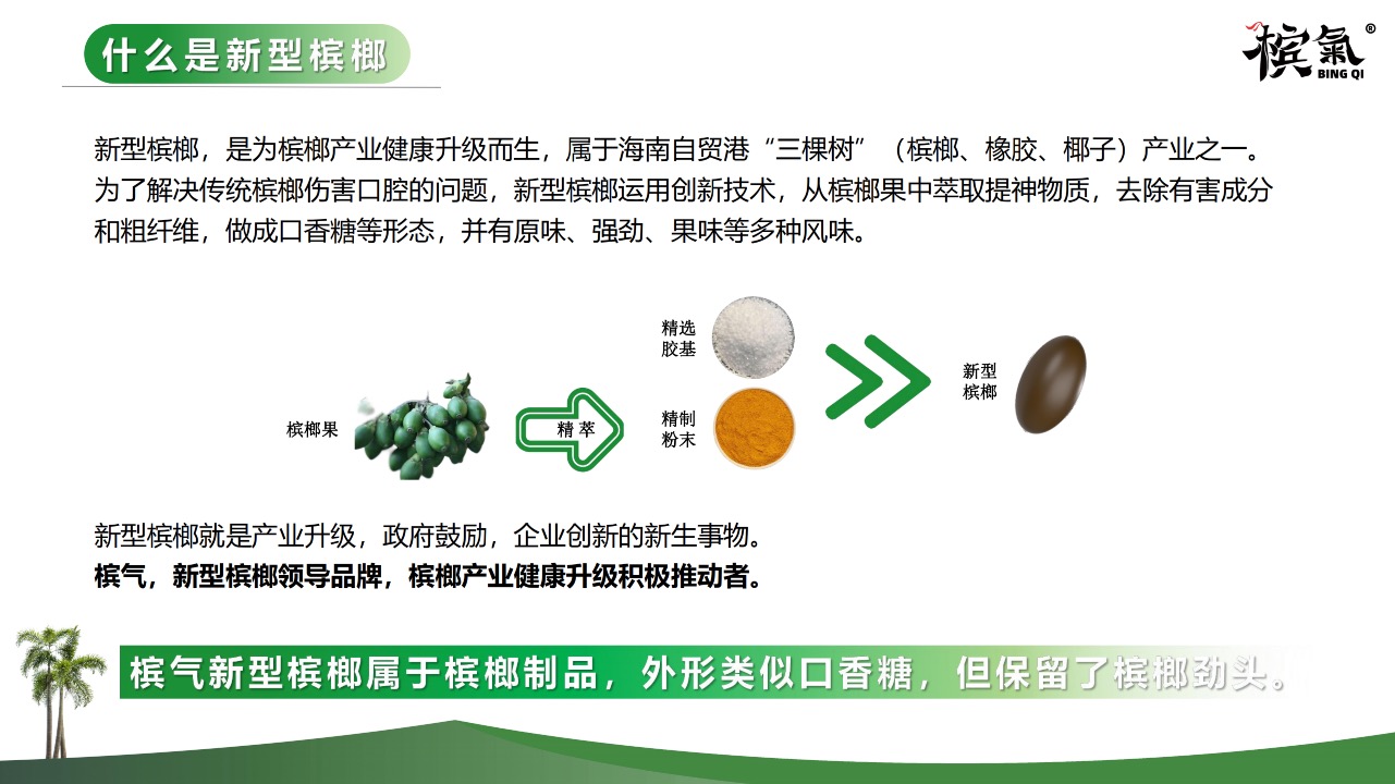 槟气通过槟榔鲜果萃取广谱提取物,加入胶基和香料等,以口香糖和压片糖等形态提供给消费者;0 纤维,不伤口,健康减害;